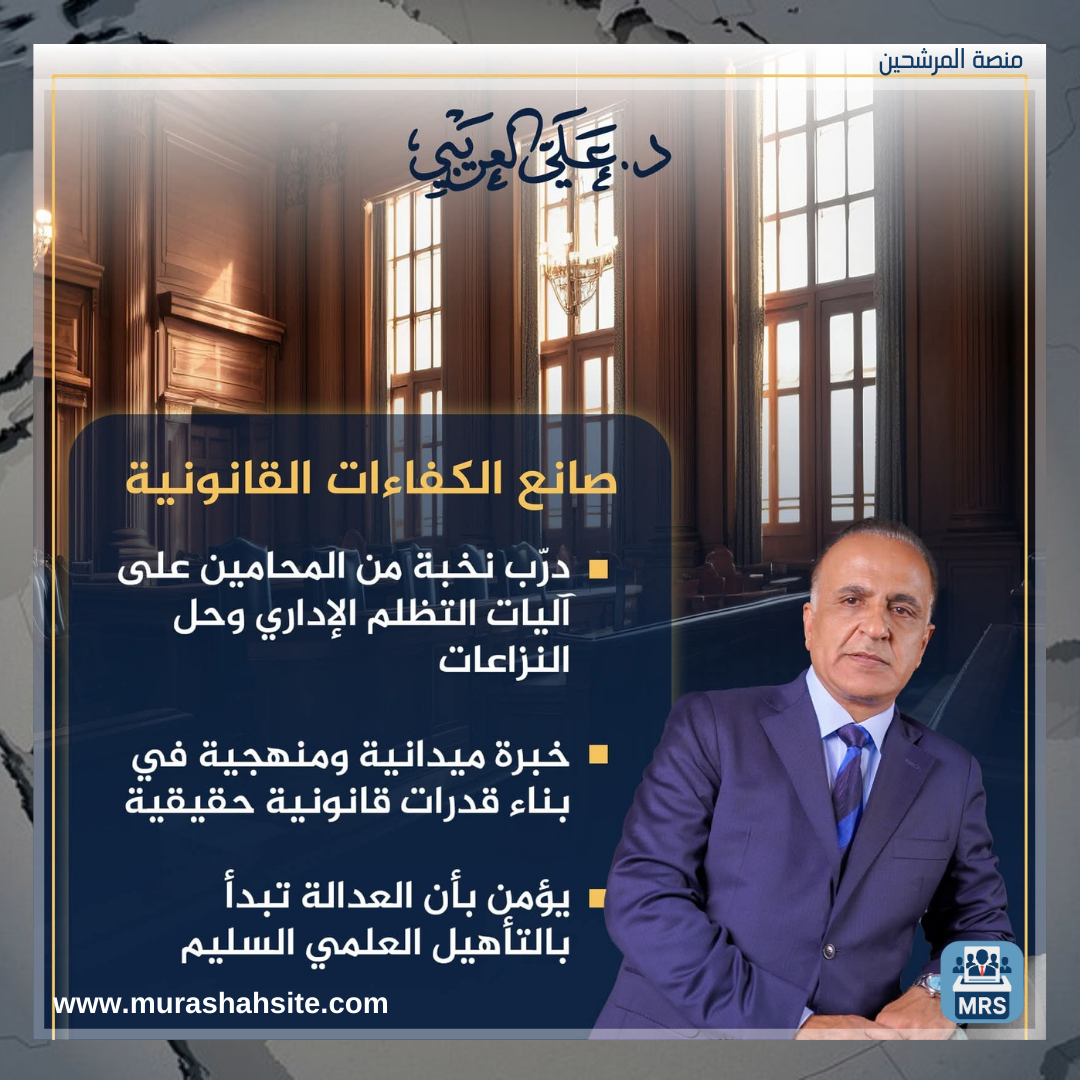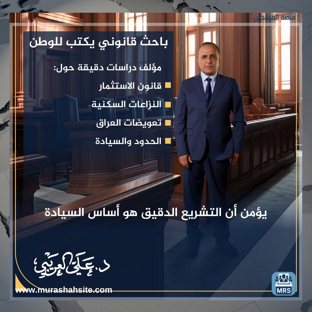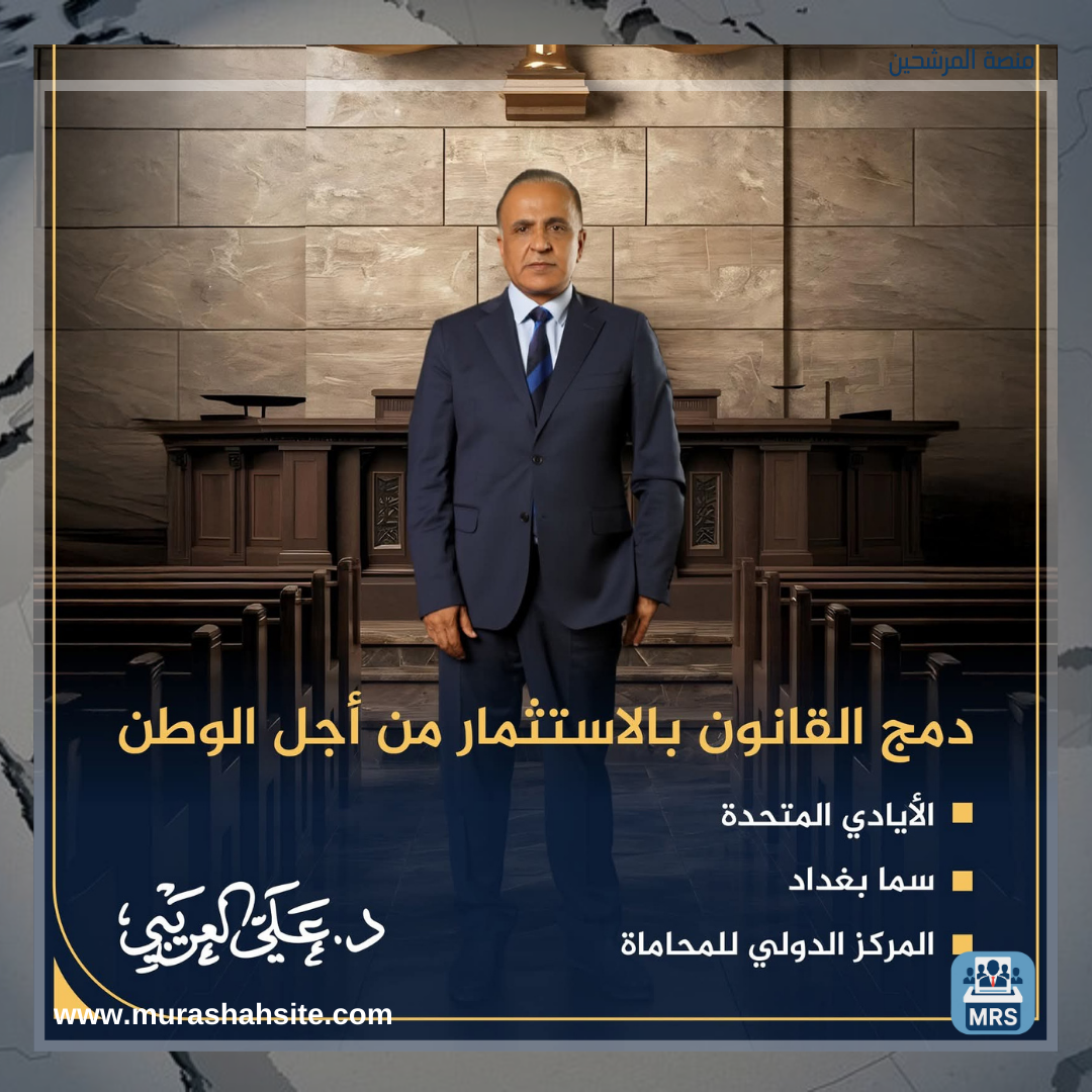 الدكتور علي العريبي، الحاصل على شهادة الدكتوراه في القانون الدولي العام من جامعة القاهرة، هو شخصية قيادية تجمع بين الخبرة القانونية العميقة والفكر الإستثماري الرائد. كرس مسيرته المهنية لخدمة وطنه العراق. مُطلقاً مشاريع تنموية وخيرية طموحة لدعم الشباب والأسر المحتاجة، واضعاً مصلحة العراق في صميم كل مبادرة.